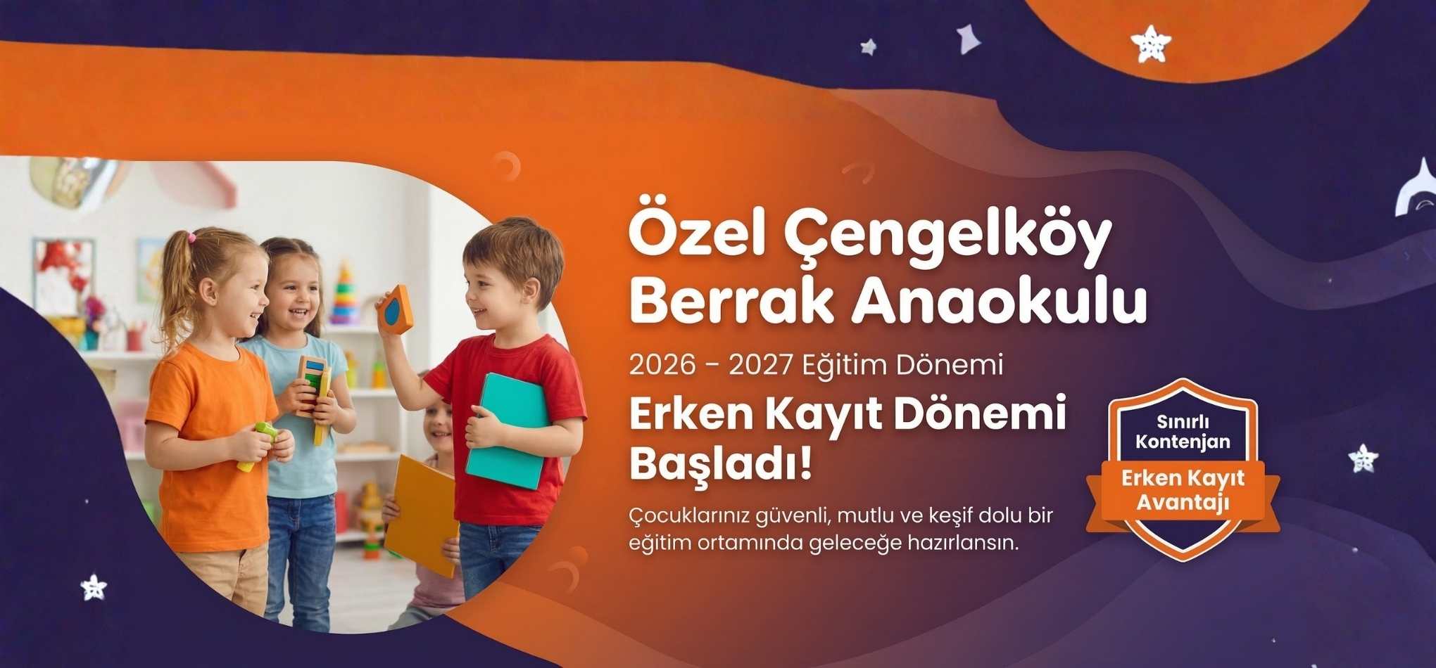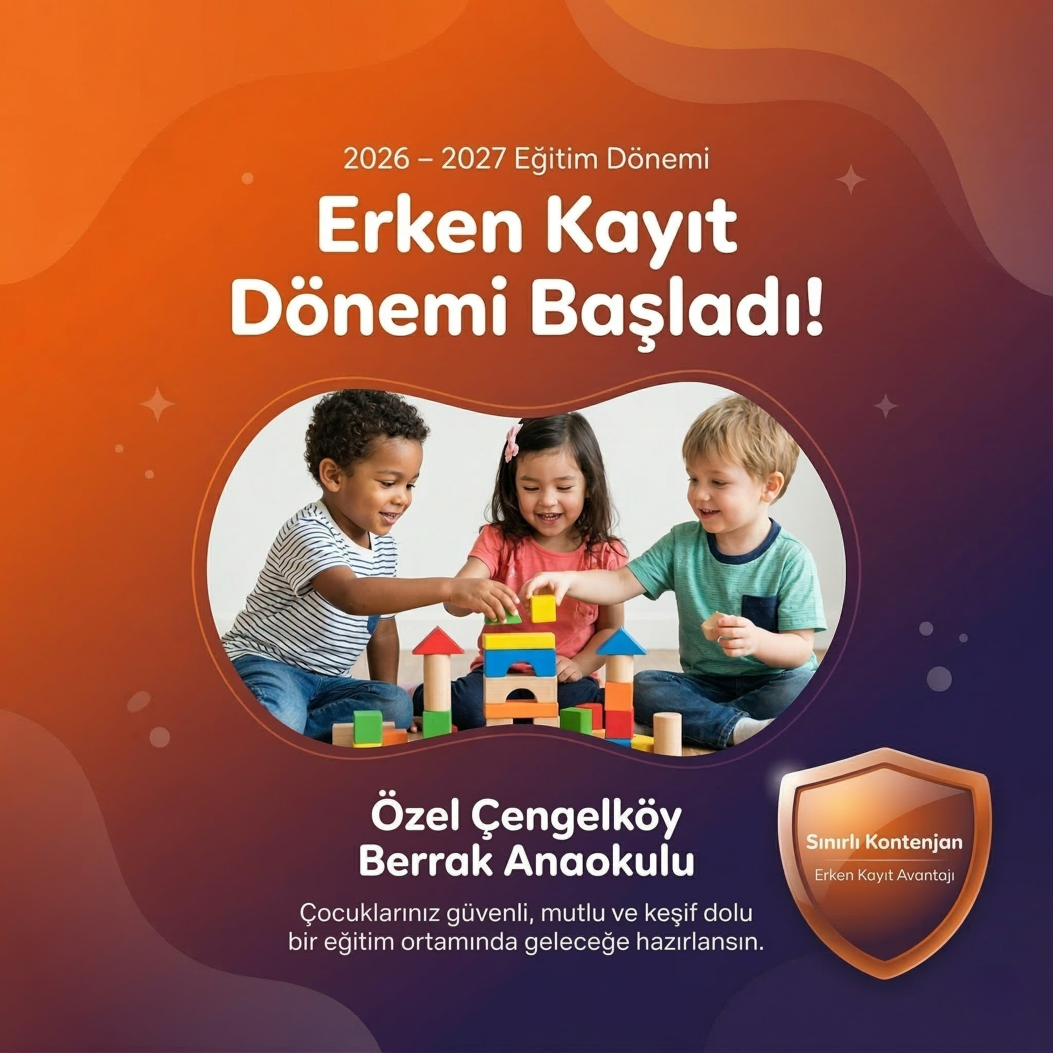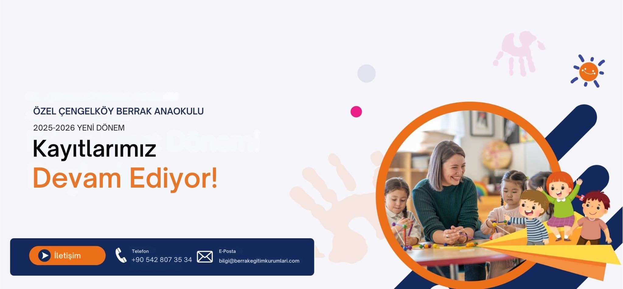Berrak Anaokulu, 3-6 yaş arası çocuklar için özenle tasarlanmış, güvenli ve sevgi dolu bir öğrenme ortamı sunmaktadır. Eğitim programımız, her çocuğun bireysel gelişim ihtiyaçlarını dikkate alarak bilişsel, duygusal, sosyal ve fiziksel alanlarda çok yönlü bir gelişimi desteklemeyi hedeflemektedir.